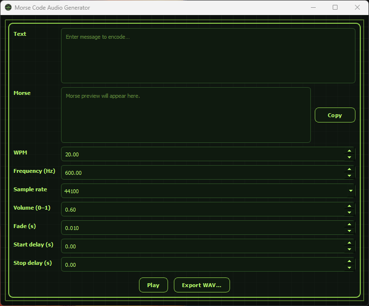 Simple little program designed to do one thing. Convert text to morse code and export it to a wav file.